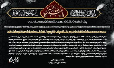 مراسم عزاداری دهه اول ماه محرم همه روزه بجز روزهای تعطیل از 6:30 صبح تا 7:30 صبح در حسینیه فرمانداری شهرستان ارومیه برگزار خواهد شد