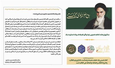 فرماندار شهرستان ارومیه در پیامی ضمن گرامیداشت قیام 15 خرداد، سالگرد ارتحال ملکوتی حضرت امام (ره) را به عموم مسلمین و رهروان ایشان تسلیت گفت