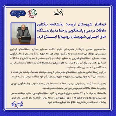 فرماندار شهرستان ارومیه: بخشنامه برگزاری ملاقات مردمی و پاسخگویی بر خط مدیران دستگاه های اجــــــرایی شـهرستان ارومیــه را ابـــــــــــلاغ کرد.